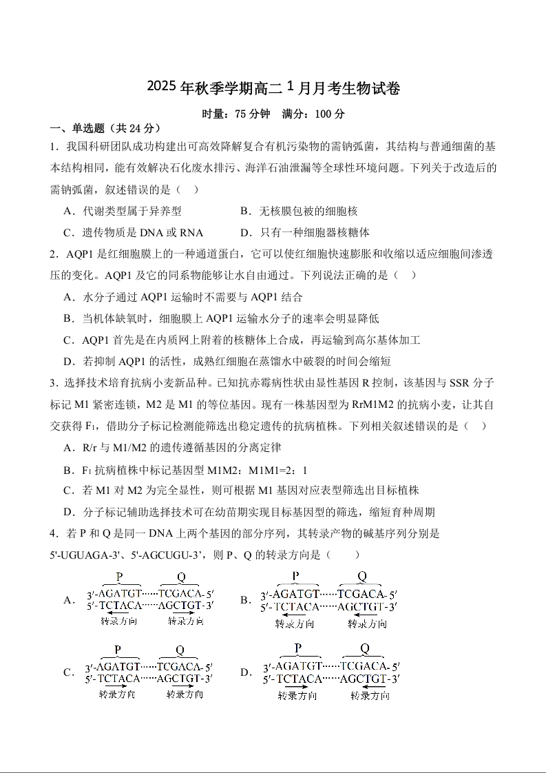 高二生物+答案--湖南省娄底市第一中学2025-2026学年高二上学期1月月考