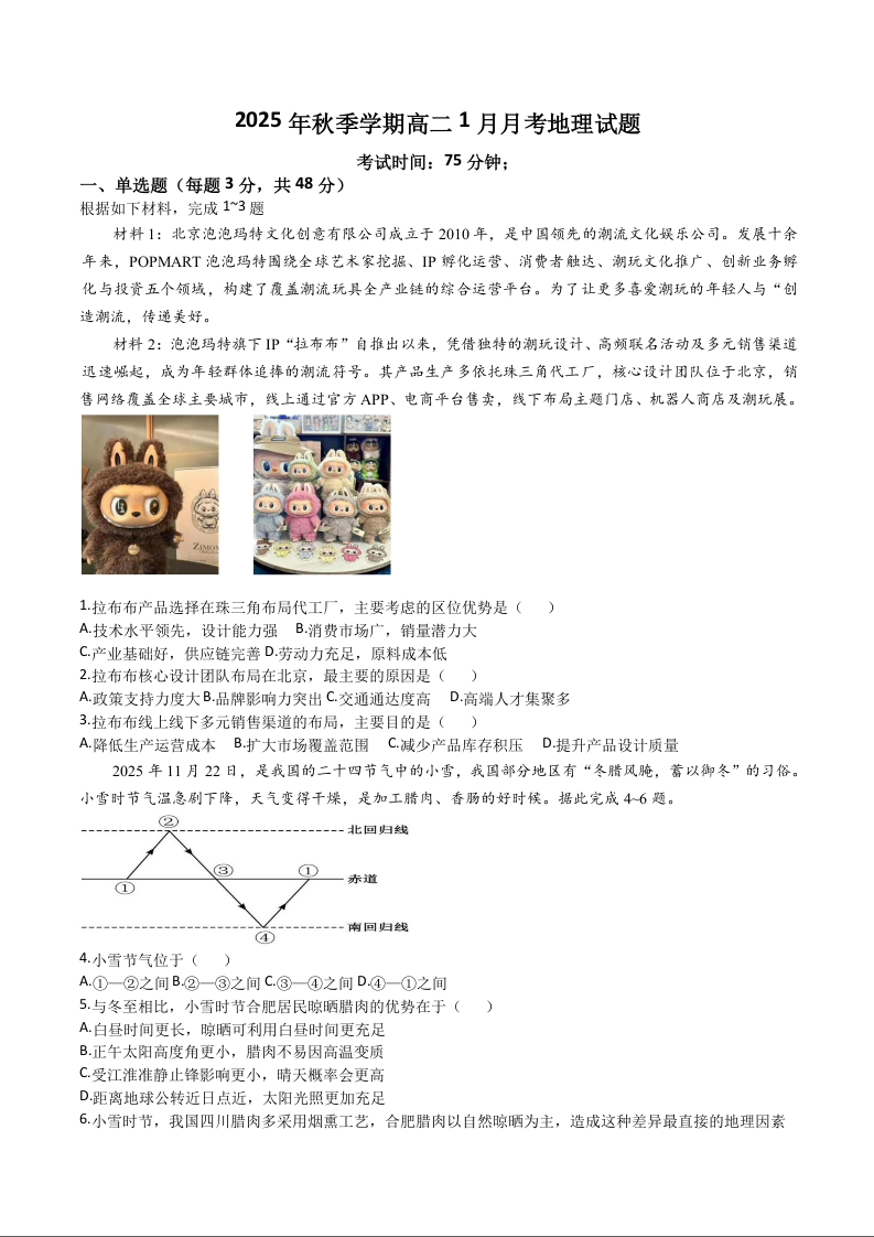 高二地理+答案--湖南省娄底市第一中学2025-2026学年高二上学期1月月考