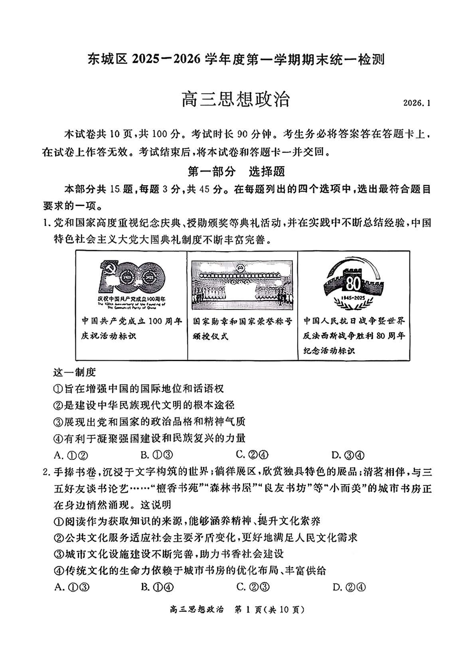 高三政治+答案--北京市东城区2026届高三上学期1月期末考试