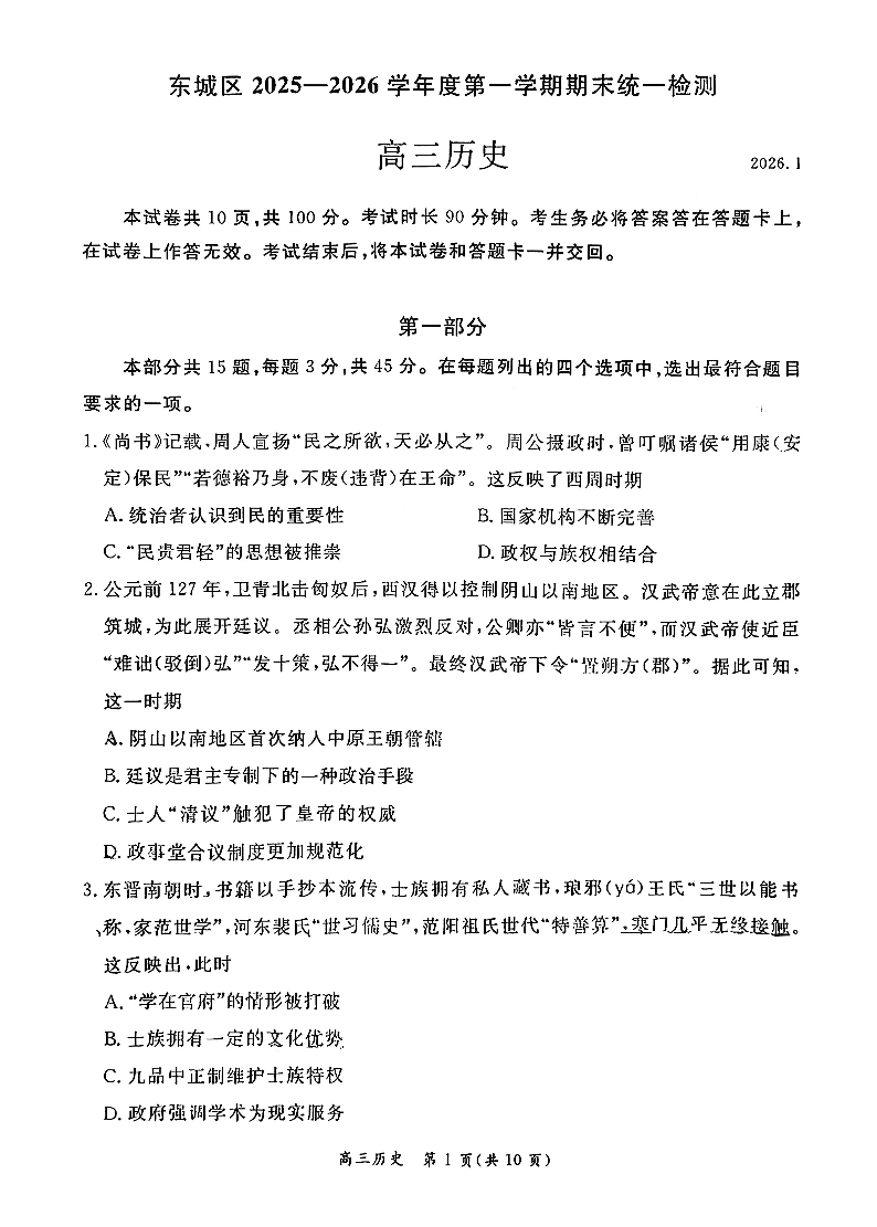 高三历史--北京市东城区2026届高三上学期1月期末考试