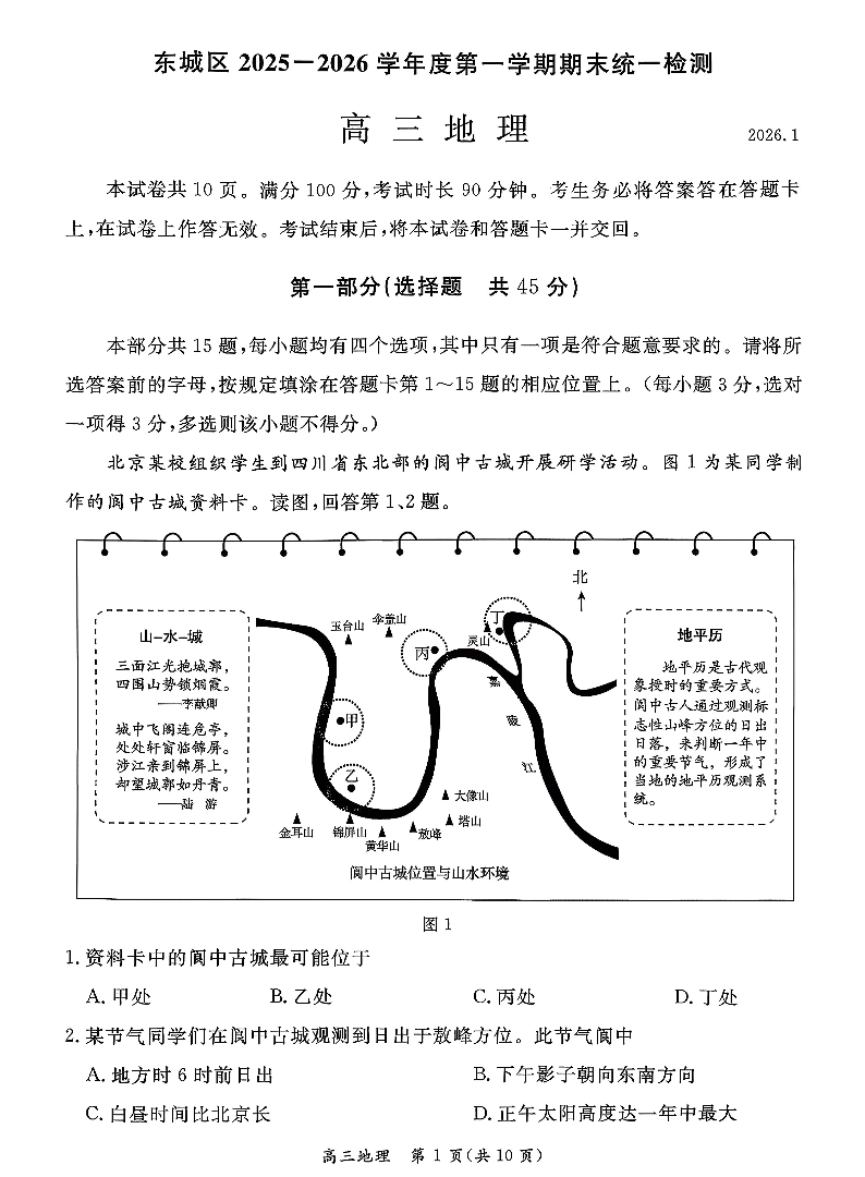 高三地理+答案--北京市东城区2026届高三上学期1月期末考试