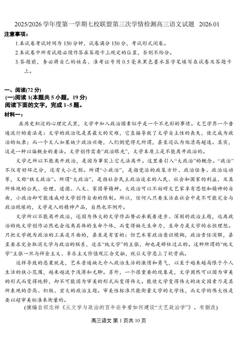 高三语文+答案--江苏省盐城市七校联盟2026届高三上学期1月第三次学情检测