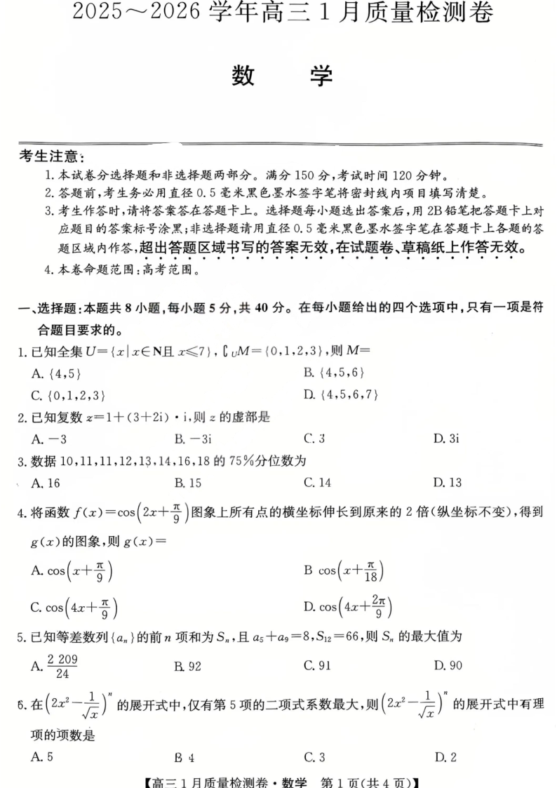 高三数学--山西三晋卓越联盟2026届高三1月质量检测