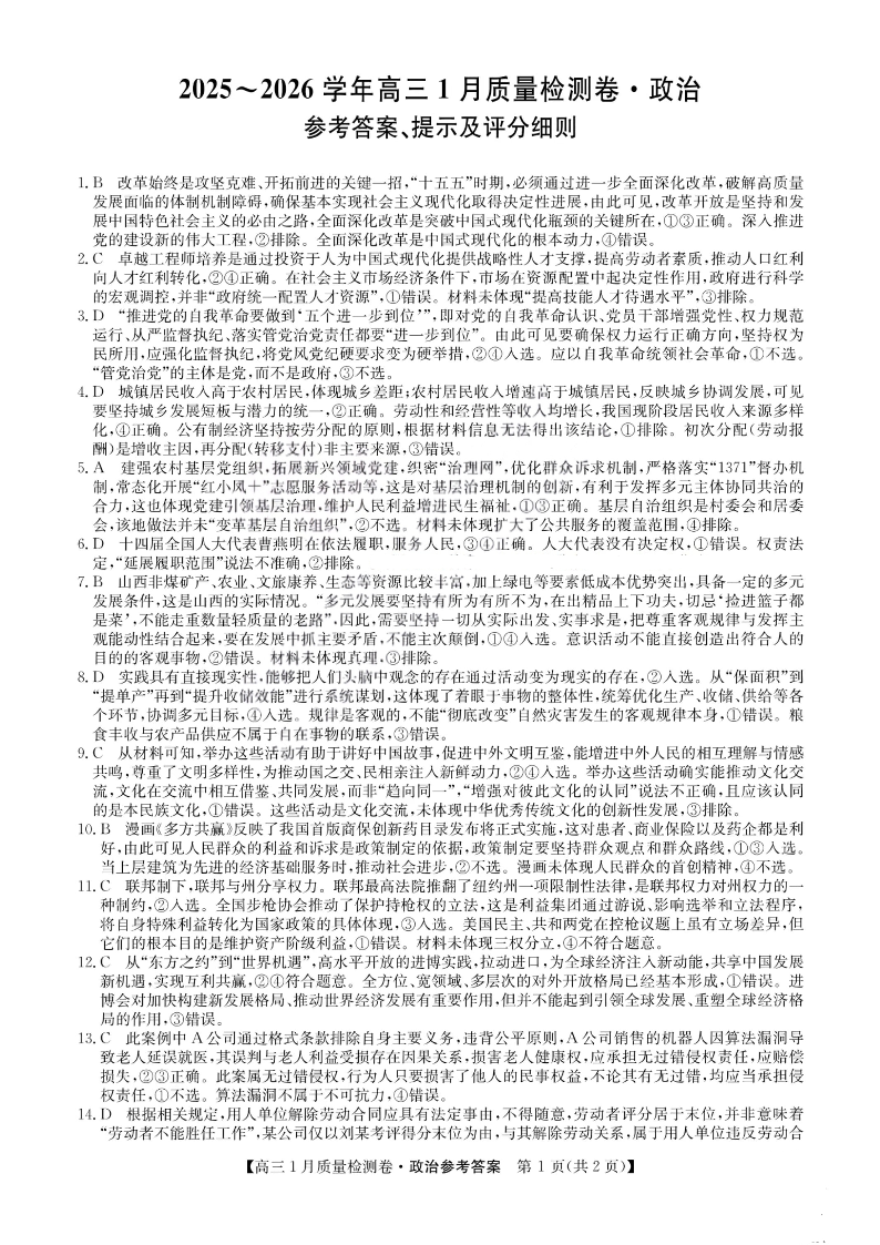 高三政治答案--山西三晋卓越联盟2026届高三1月质量检测