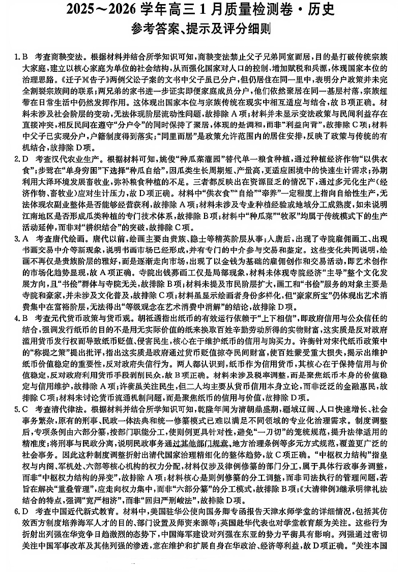 高三历史答案--山西三晋卓越联盟2026届高三1月质量检测