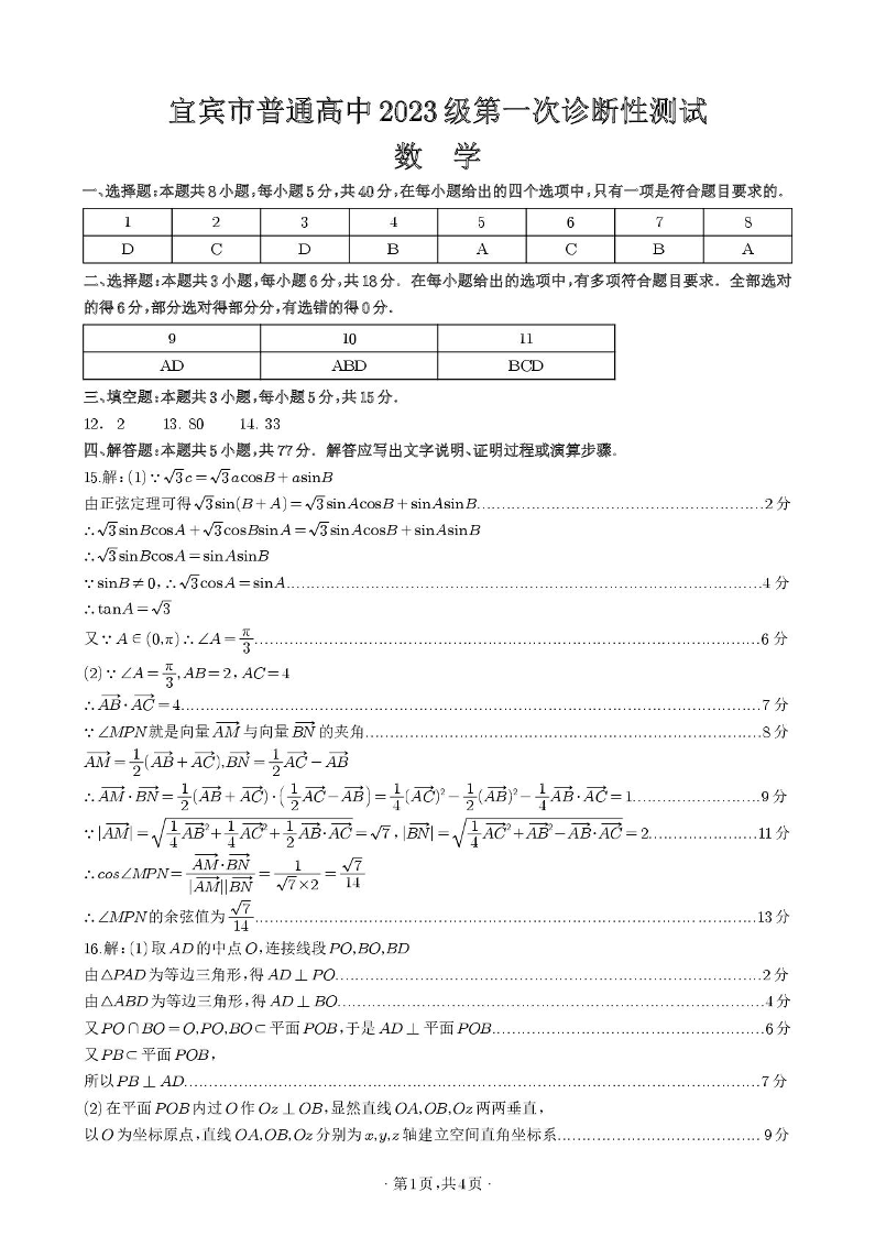 高三数学答案--四川省宜宾市普通高中2023级(2026届)高三年级第一次诊断性测试
