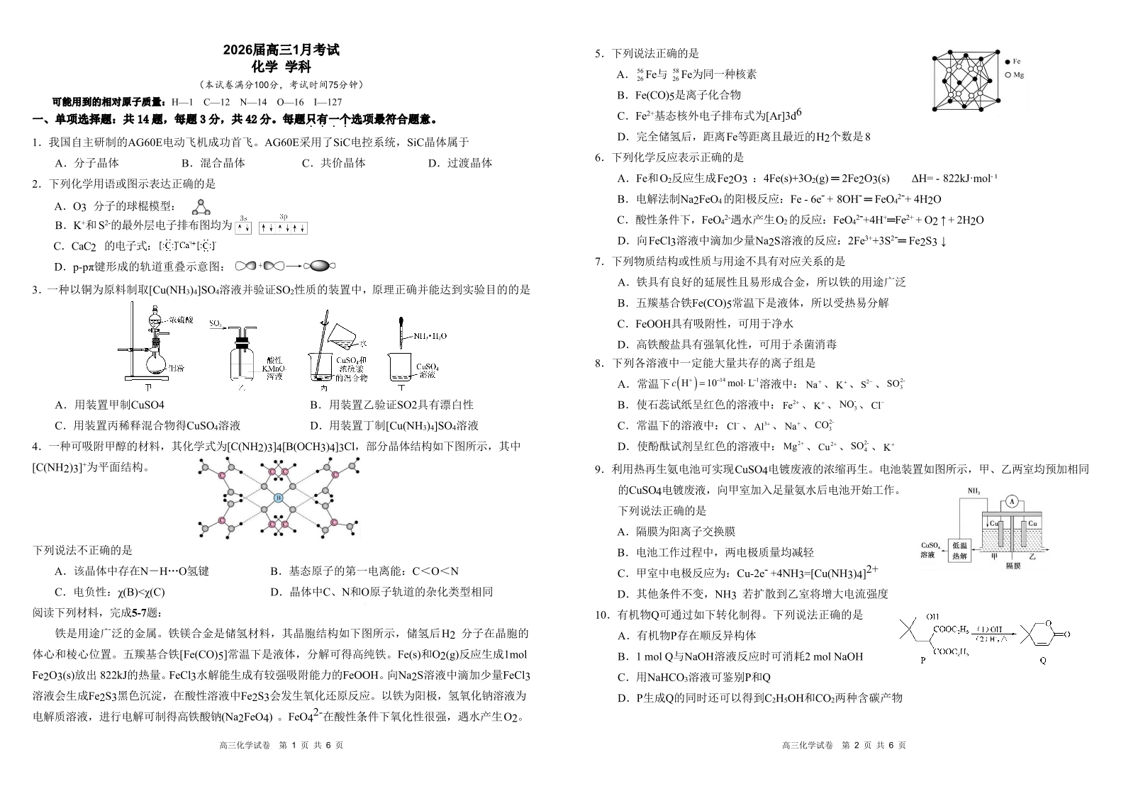高三化学--安徽省合肥一中2026届高三上学期1月期末考试