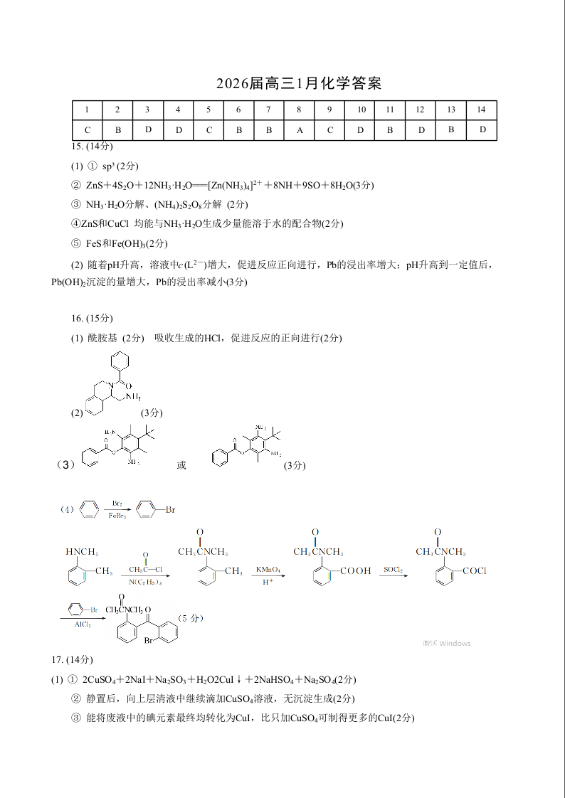 高三化学答案--安徽省合肥一中2026届高三上学期1月期末考试