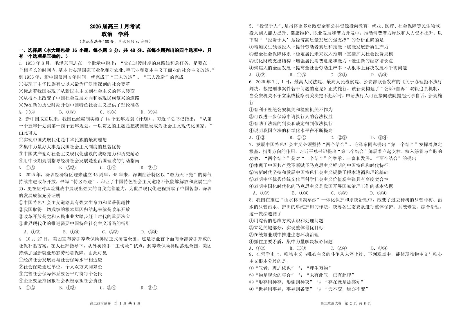 高三政治--安徽省合肥一中2026届高三上学期1月期末考试