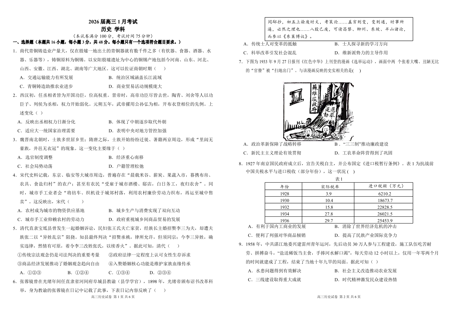 高三历史--安徽省合肥一中2026届高三上学期1月期末考试