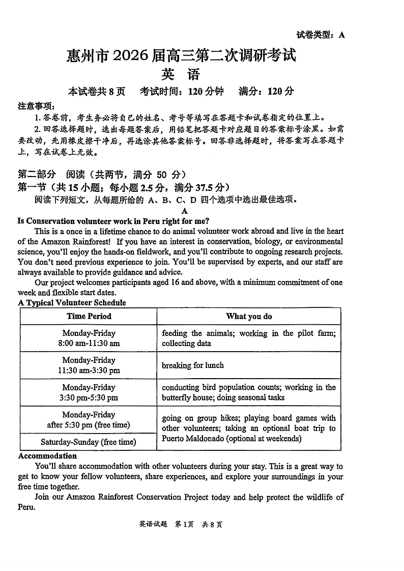 高三英语+答案--广东省惠州市2026届高三上学期第二次调研考试(惠州二调)