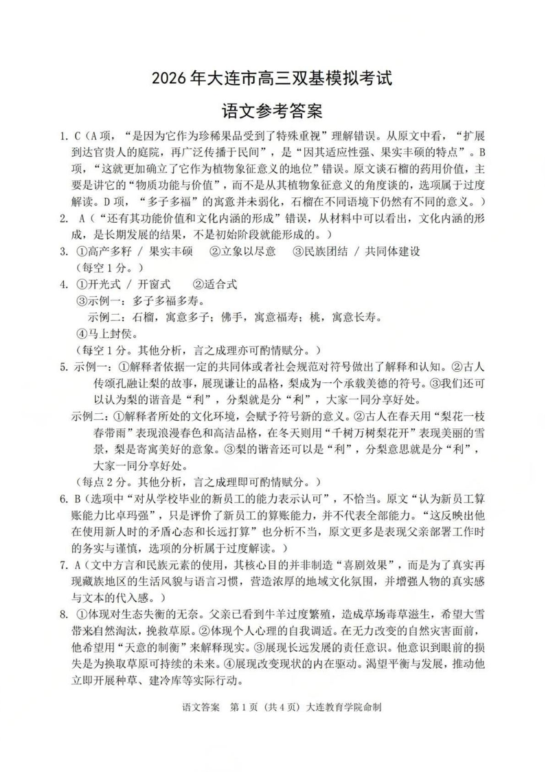 高三语文答案--辽宁省大连市2026届高三上学期1月双基模拟考试