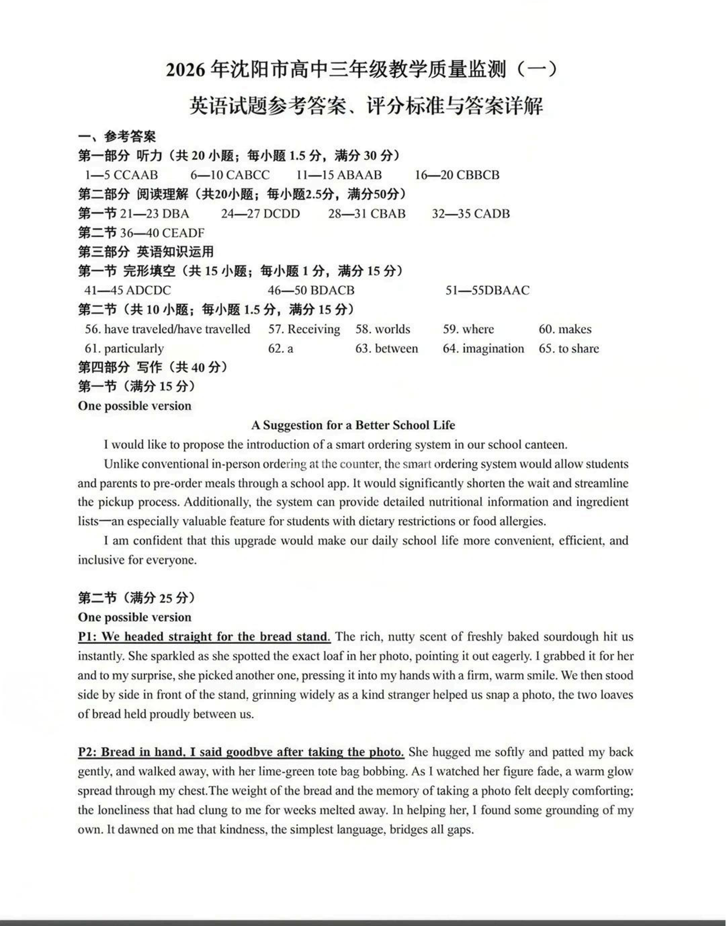 高三英语答案--辽宁省沈阳市2026届高三教学质量检测(一)(沈阳一模)
