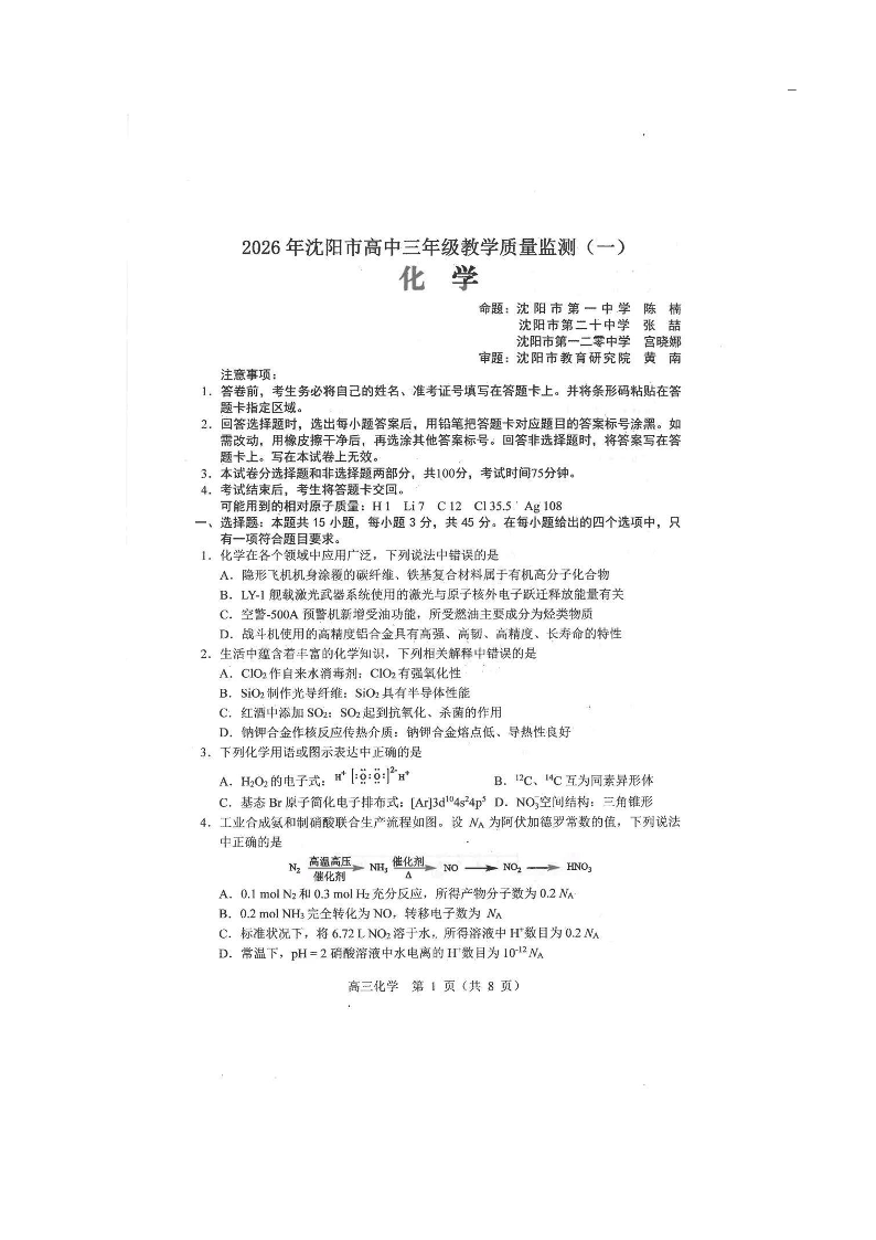 高三化学--辽宁省沈阳市2026届高三教学质量检测(一)(沈阳一模)