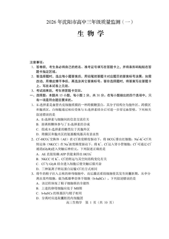 高三生物+答案--辽宁省沈阳市2026届高三教学质量检测(一)(沈阳一模)