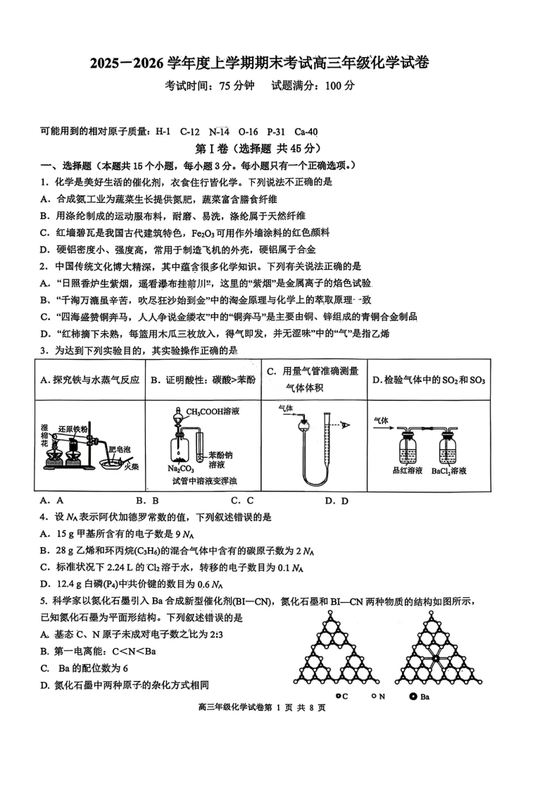 高三化学--辽宁省五校联盟2026届高三上学期1月期末考试(东北育才、省实验、大连八中、24中、鞍山一中)