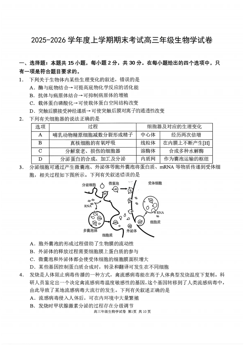 高三生物--辽宁省五校联盟2026届高三上学期1月期末考试(东北育才、省实验、大连八中、24中、鞍山一中)