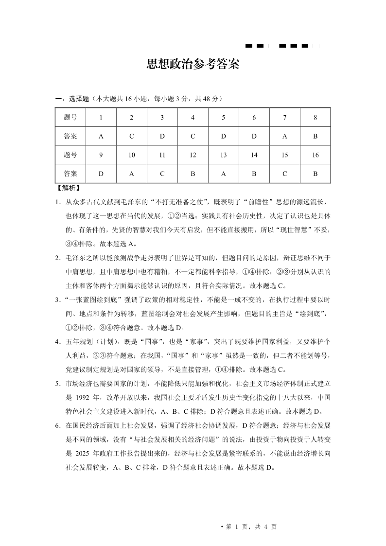 高三政治答案--重庆市第八中学2026届高考适应性月考卷(五)