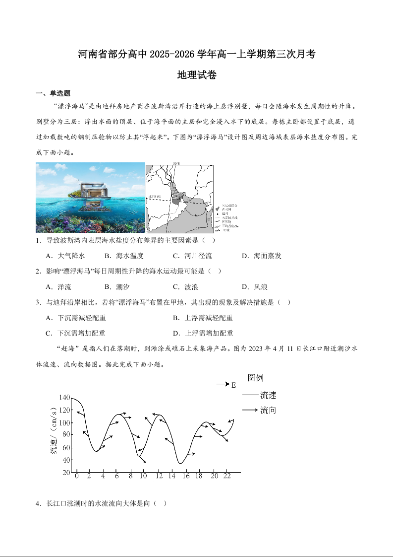 高一地理+答案--河南省部分高中2025-2026学年高一上学期第三次月考