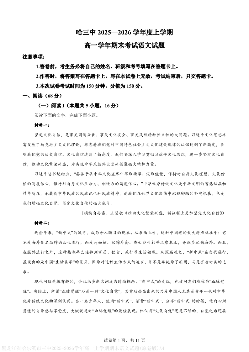 高一语文--黑龙江省哈尔滨市第三中学校2025-2026学年高一上学期1月期末