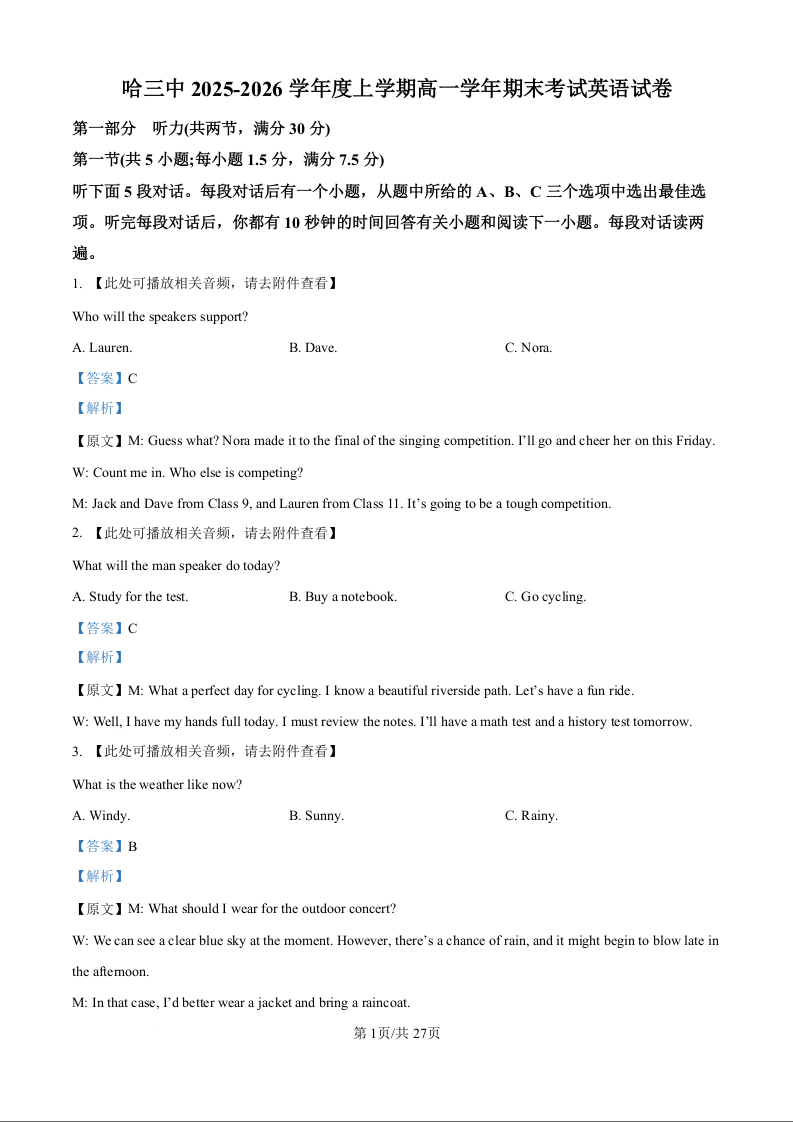 高一英语(精品解析版)--黑龙江省哈尔滨市第三中学校2025-2026学年高一上学期1月期末