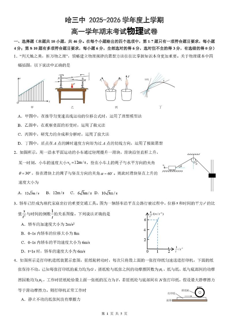 高一物理--黑龙江省哈尔滨市第三中学校2025-2026学年高一上学期1月期末
