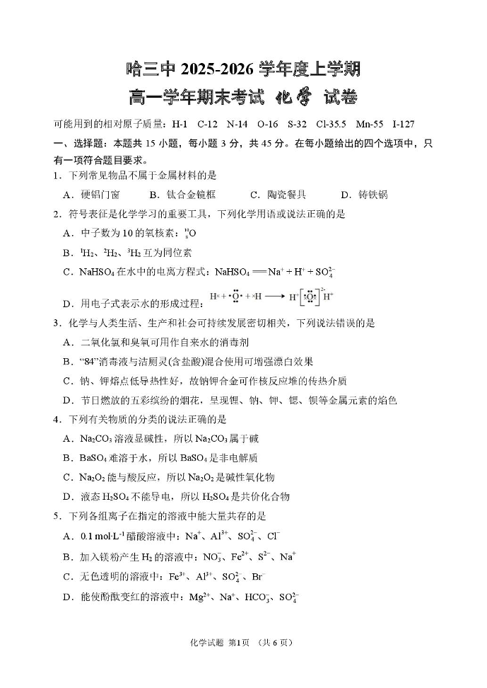 高一化学--黑龙江省哈尔滨市第三中学校2025-2026学年高一上学期1月期末