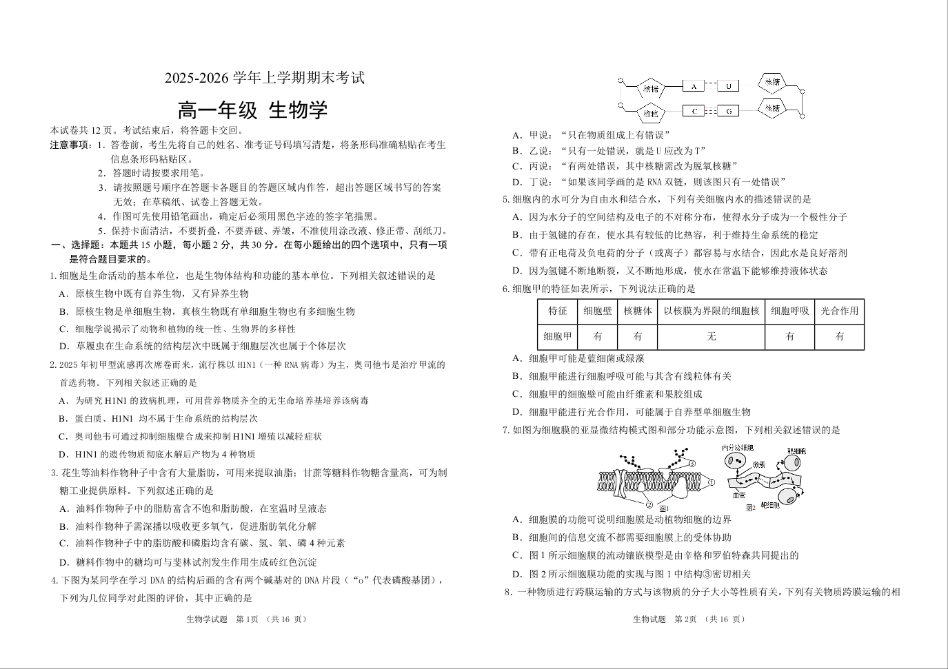 高一生物+答案--吉林省长春外国语学校2025-2026学年高一上学期期末考试