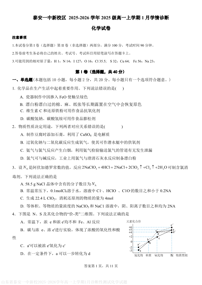 高一化学+答案--山东省泰安市第一中学(青年路校区)2025-2026学年高一上学期1月诊断性测试
