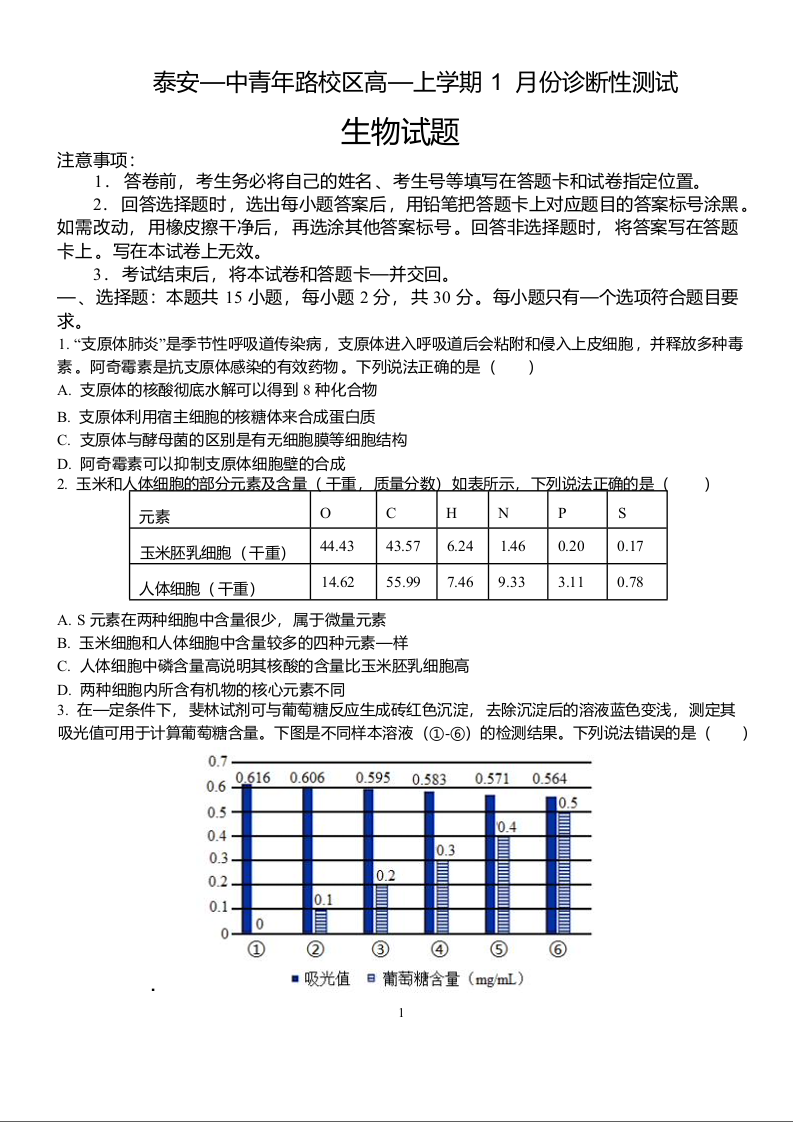 高一生物+答案--山东省泰安市第一中学(青年路校区)2025-2026学年高一上学期1月诊断性测试