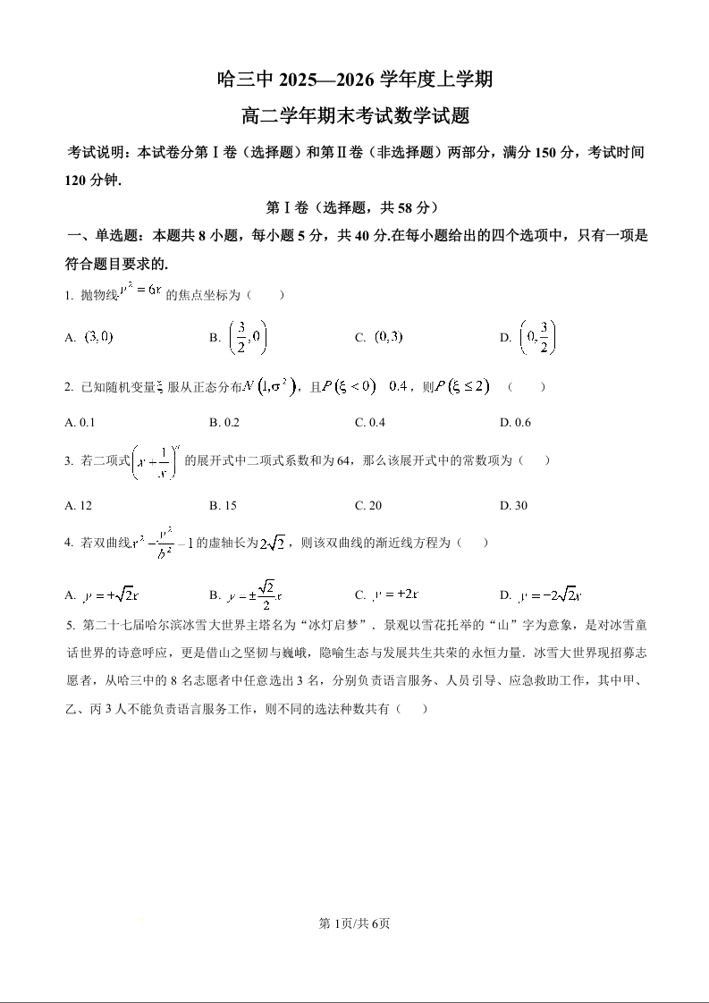 高二数学(原卷版)--黑龙江省哈尔滨市第三中学校2025-2026学年高二上学期1月期末