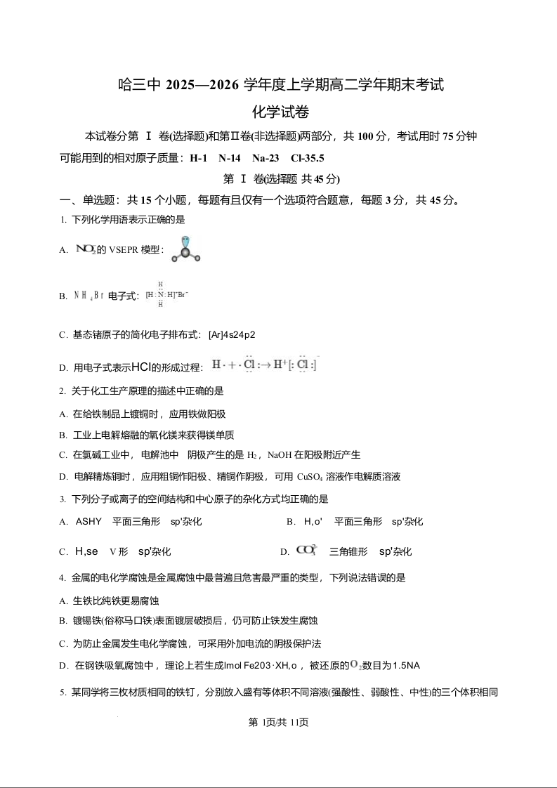 高二化学+答案--黑龙江省哈尔滨市第三中学校2025-2026学年高二上学期1月期末