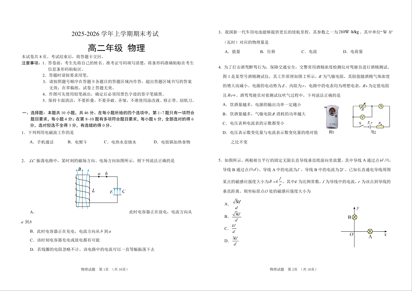 高二物理+答案--吉林省长春外国语学校2025-2026学年高二上学期期末考试