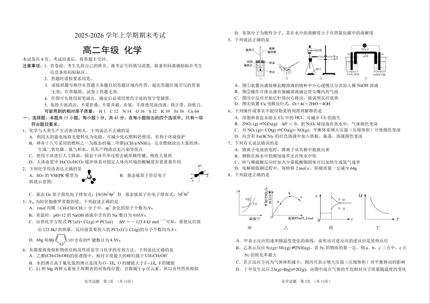 高二化学+答案--吉林省长春外国语学校2025-2026学年高二上学期期末考试