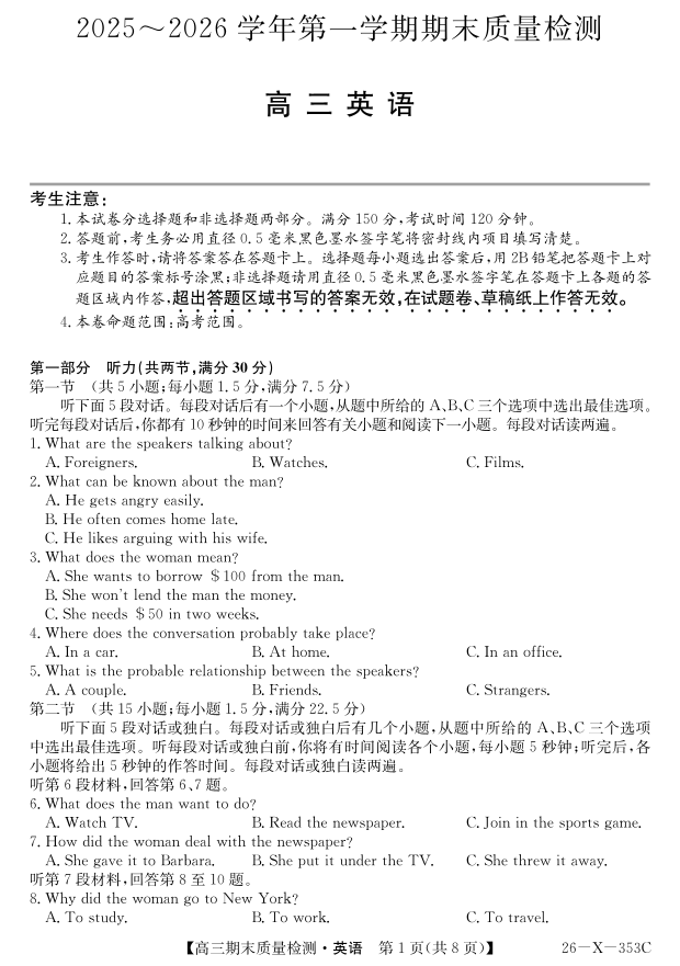 高三英语--安徽省县域合作共享联盟2026届高三上学期1月期末质量检测