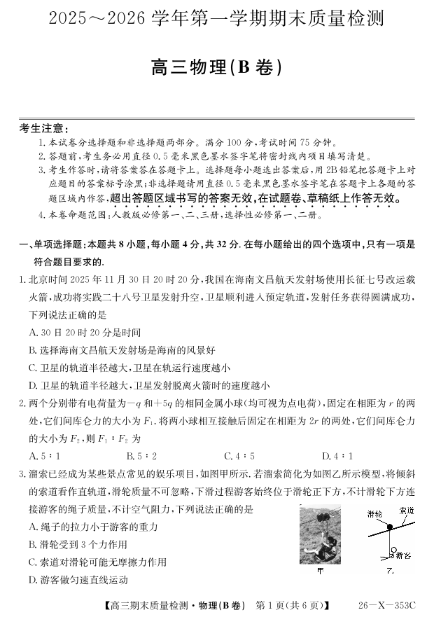 高三物理B--安徽省县域合作共享联盟2026届高三上学期1月期末质量检测