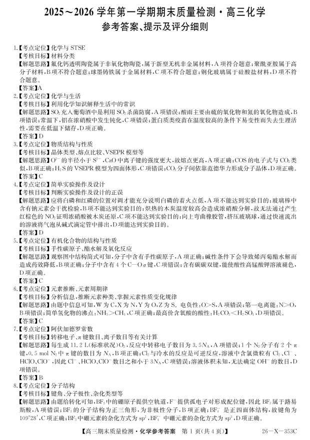 高三化学答案--安徽省县域合作共享联盟2026届高三上学期1月期末质量检测