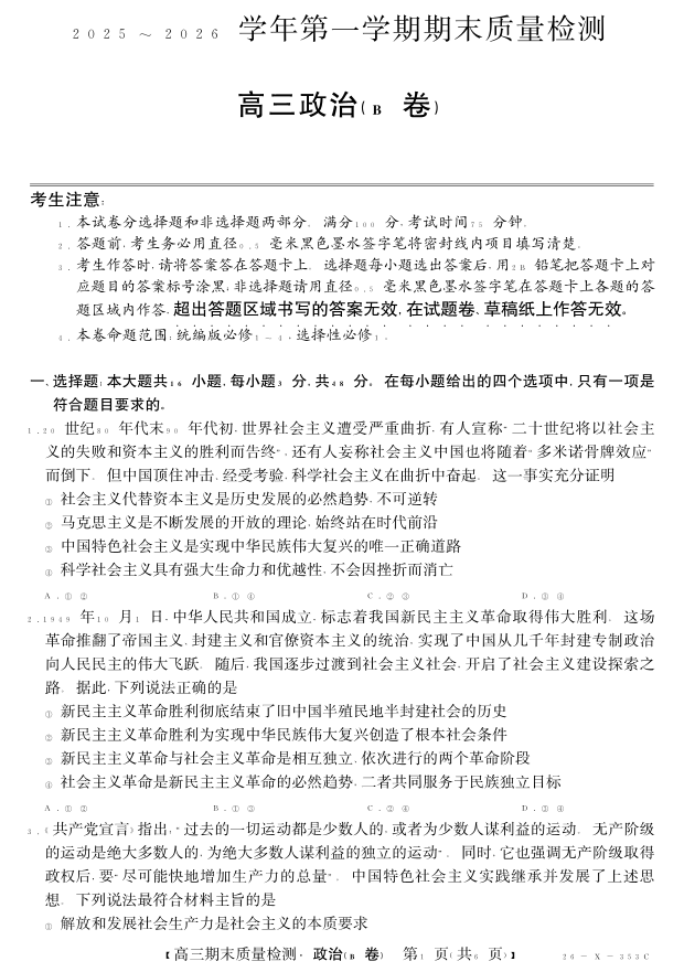 高三政治B--安徽省县域合作共享联盟2026届高三上学期1月期末质量检测