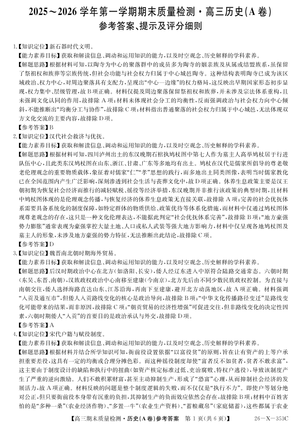 高三历史A答案--安徽省县域合作共享联盟2026届高三上学期1月期末质量检测