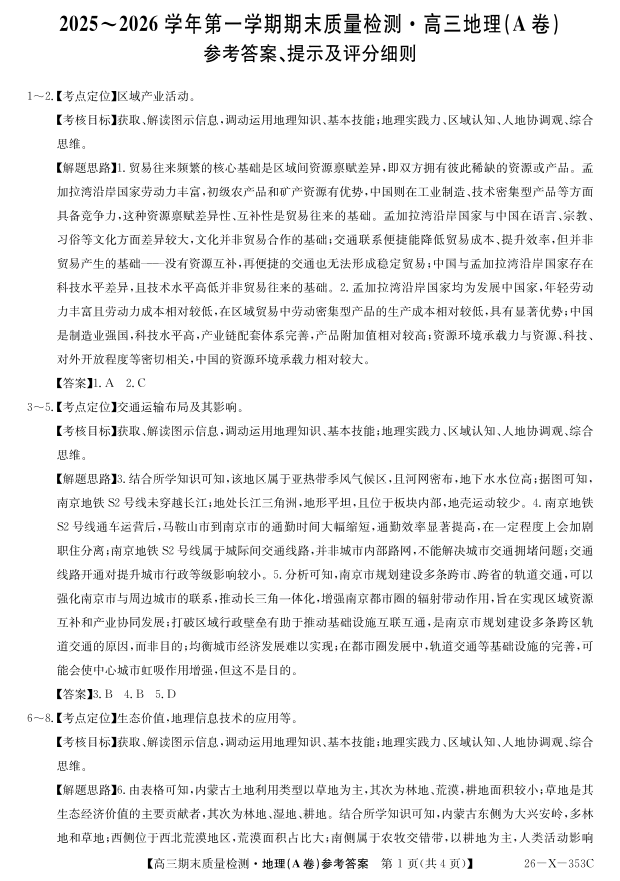 高三地理A答案--安徽省县域合作共享联盟2026届高三上学期1月期末质量检测