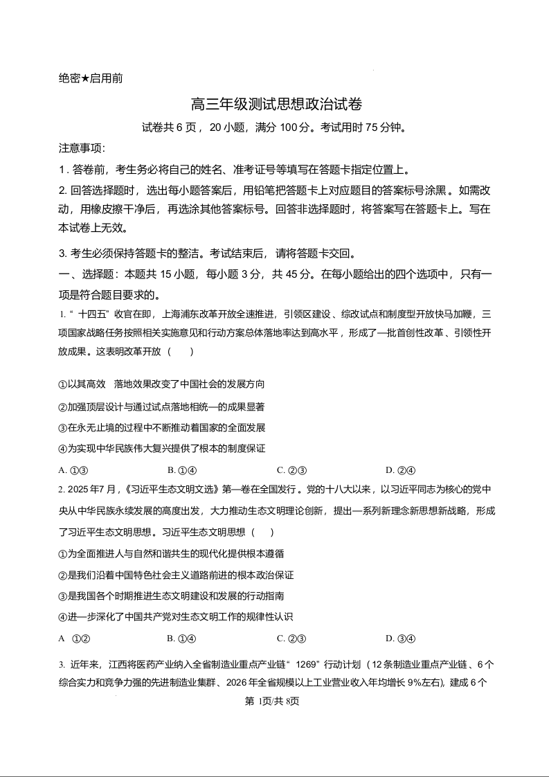 高三政治+答案--江西省上进联考2026届高三上学期1月联考