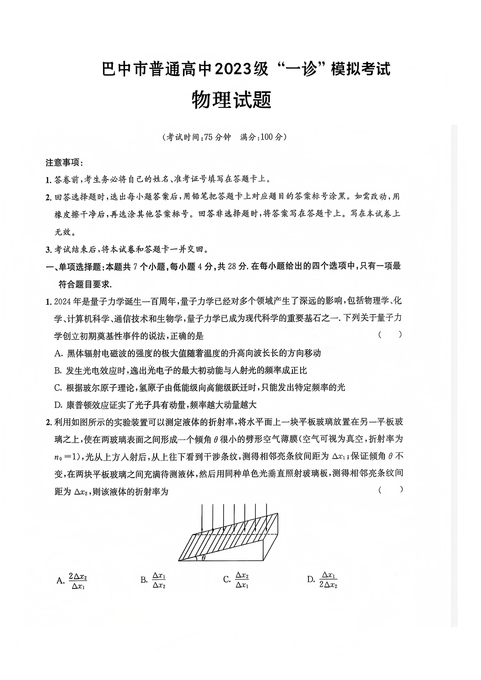 高三物理--四川省巴中市普通高中2023级“一诊”模拟考试