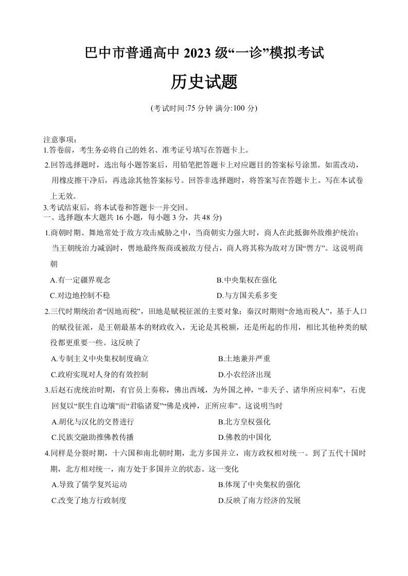 高三历史+答案--四川省巴中市普通高中2023级“一诊”模拟考试
