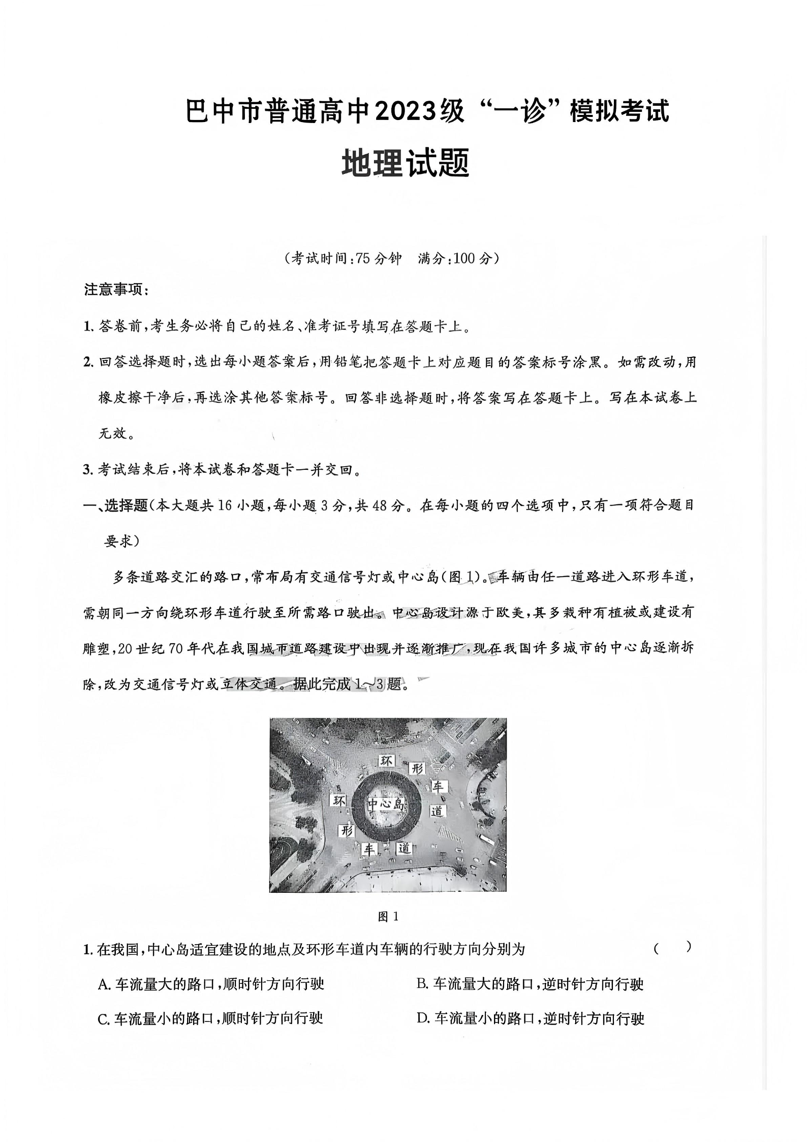 高三地理--四川省巴中市普通高中2023级“一诊”模拟考试