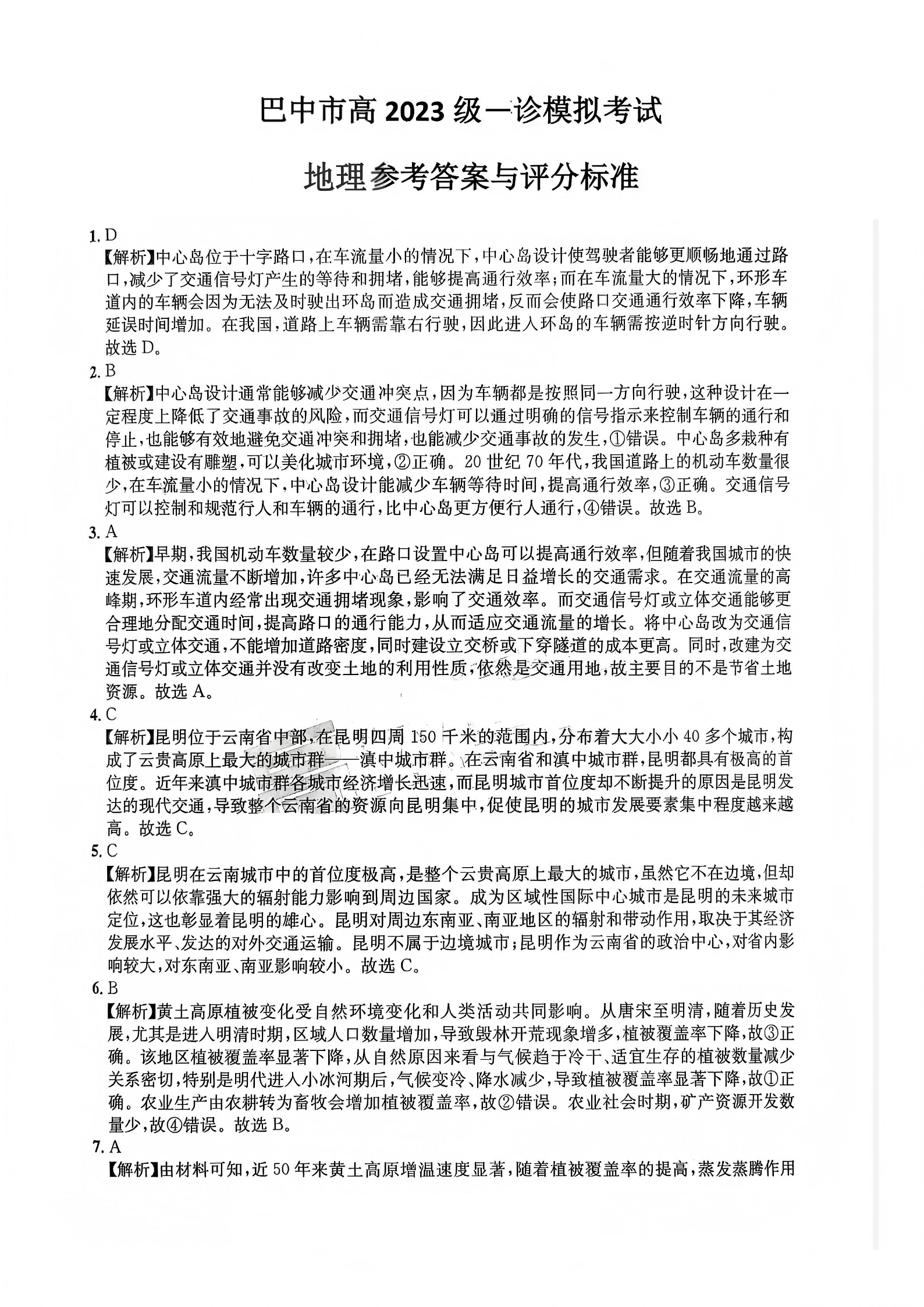 高三地理答案--四川省巴中市普通高中2023级“一诊”模拟考试
