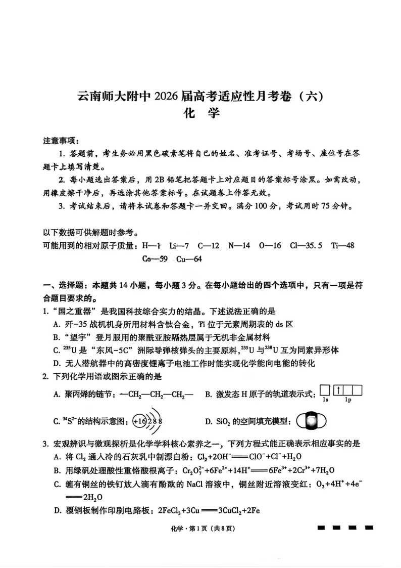 高三化学--云南师大附中2026届高三1月高考适应性月考卷(六)