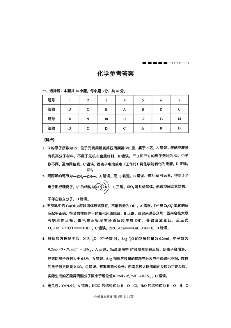 高三化学答案--云南师大附中2026届高三1月高考适应性月考卷(六)