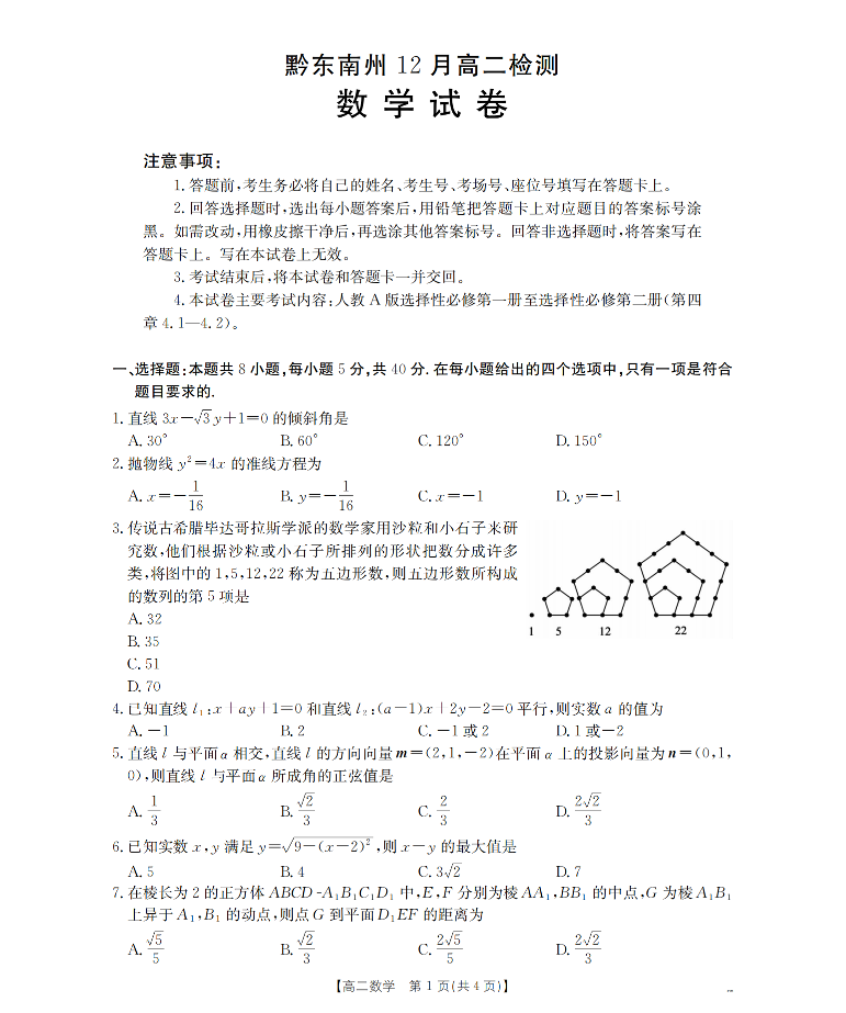 高二数学--贵州省黔东南州2025-2026学年高二上学期12月检测试卷