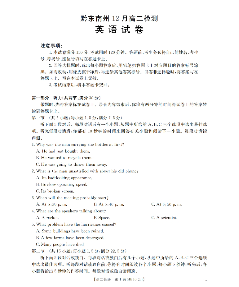 高二英语--贵州省黔东南州2025-2026学年高二上学期12月检测试卷