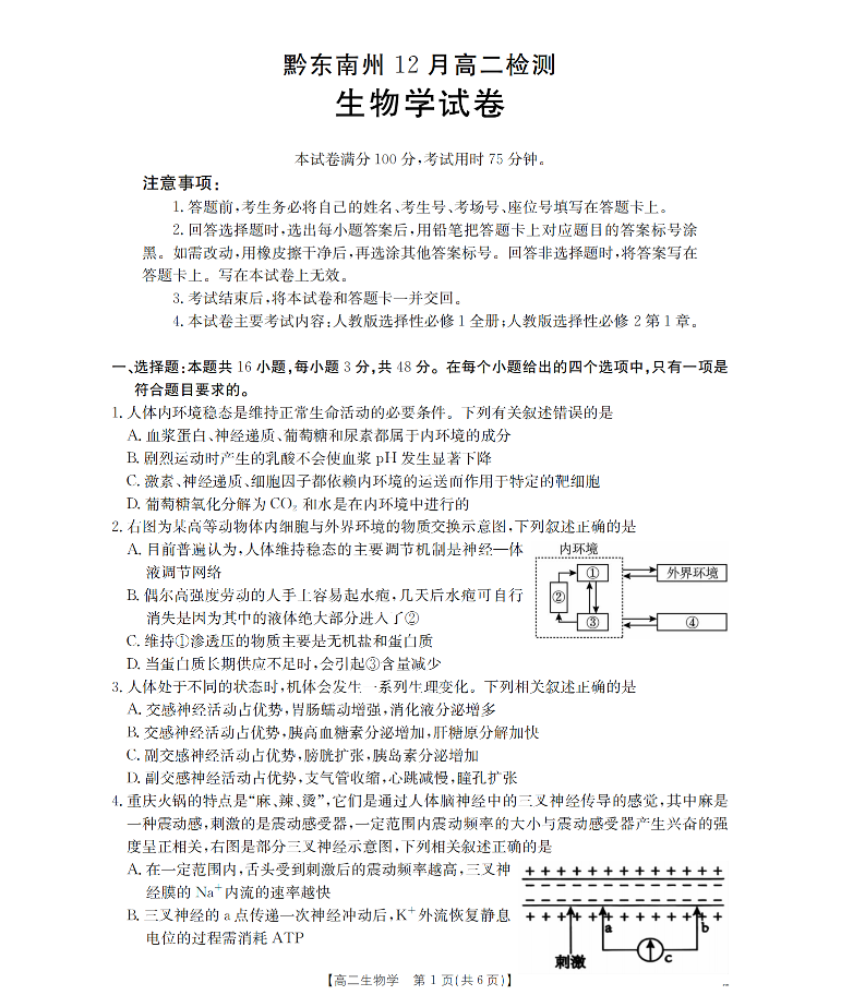 高二生物--贵州省黔东南州2025-2026学年高二上学期12月检测试卷
